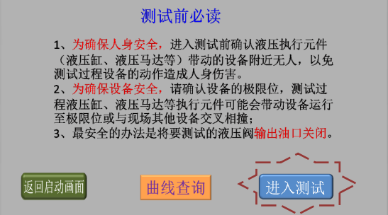 3、確認(rèn)現(xiàn)場(chǎng)人員和設(shè)備安全后,點(diǎn)擊“進(jìn)入測(cè)試”,進(jìn)入液壓閥測(cè)試類型選擇畫面;