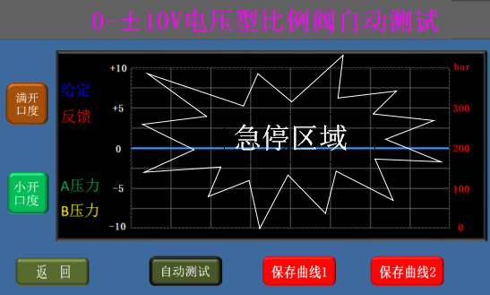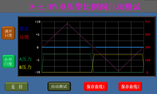 8、* 選擇滿開(kāi)口度后點(diǎn)擊“自動(dòng)測(cè)試”可使比例閥從0開(kāi)口度逐漸增加到+100%開(kāi)口度,再逐漸減少到-100%,然后逐漸增加到0開(kāi)口度;
