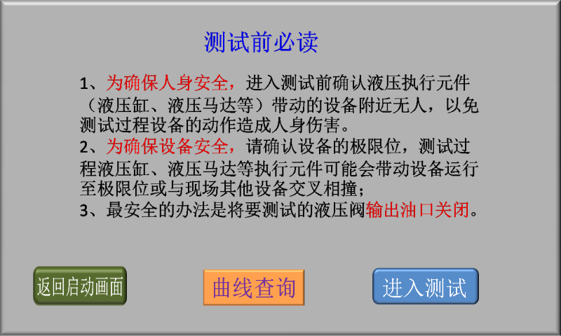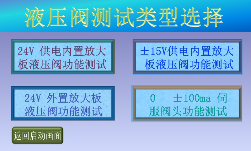 3、確認(rèn)現(xiàn)場人員和設(shè)備安全后,點擊“進入測試”,進入液壓閥測試類型選擇畫面;